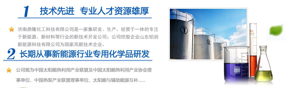 濟南鼎隆化工科技有限公司是一家集研發(fā)、生產(chǎn)、經(jīng)營于一體的專注于新能源、新材料等行業(yè)的新技術開發(fā)公司;公司控股企業(yè)山東鉑潤新能源科技有限公司為國家高新技術企業(yè)。擁有雄厚的科研實力和專業(yè)銷售隊伍以及多名從事化學化工專業(yè)的高素質人員,其中博士生導師1人,碩士研究生3人。公司現(xiàn)為中國太陽能熱利用產(chǎn)業(yè)聯(lián)盟及中國太陽能熱利用產(chǎn)業(yè)協(xié)會理事單位、中國熱泵產(chǎn)業(yè)聯(lián)盟理事單位、山東清潔能源供暖產(chǎn)業(yè)聯(lián)盟理事單位、太陽能與輔助能源互補供熱/制冷工程專業(yè)委員會會員單位。公司專注于綠色科技,專業(yè)化研發(fā)環(huán)境友好型化工產(chǎn)品,與眾多高校和國內外多家著名化學品公司保持戰(zhàn)略合作關系。公司擁有“載能”和“澤能”...更多